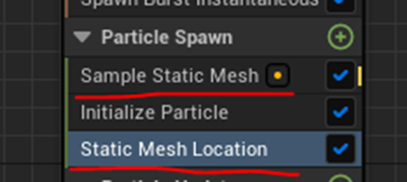 そしてParticle Spawn SectionにStatic Mesh Location Moduleを追加します。