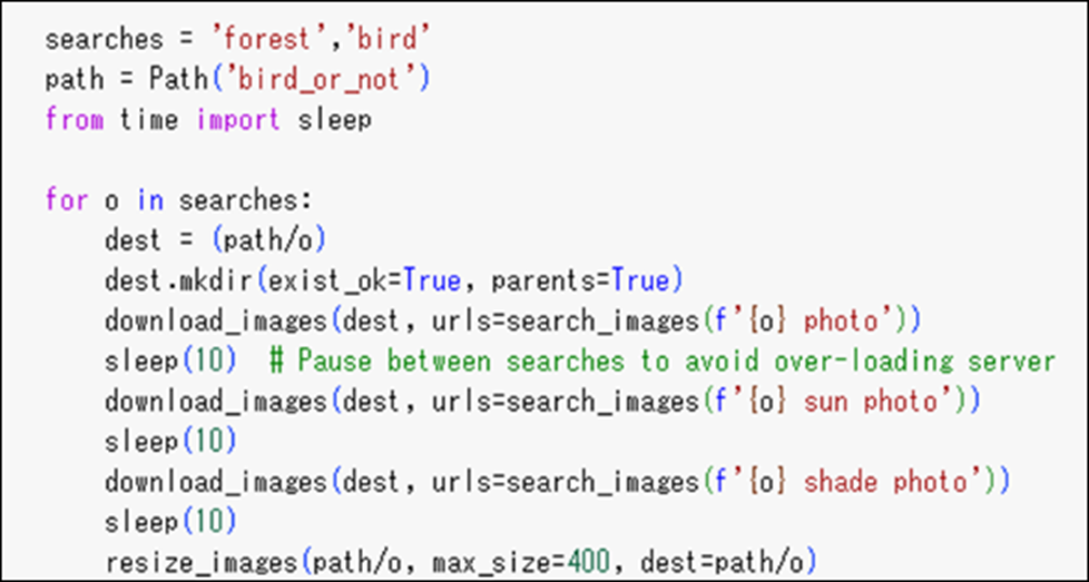 Is it a bird? Creating a model from your own data [3]の「Step 2: Train our model」のData Blockを作成するところまでやっていました。