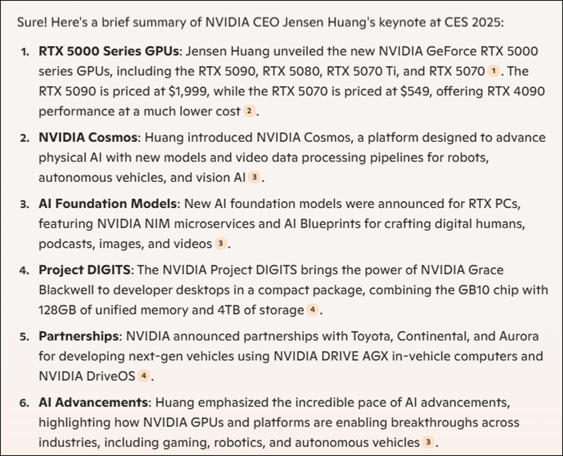 [4] NVIDIA. (2025, January 7). NVIDIA CEO Jensen Huang keynote at CES 2025 [Video]. YouTube. https://www.youtube.com/watch?v=k82RwXqZHY8