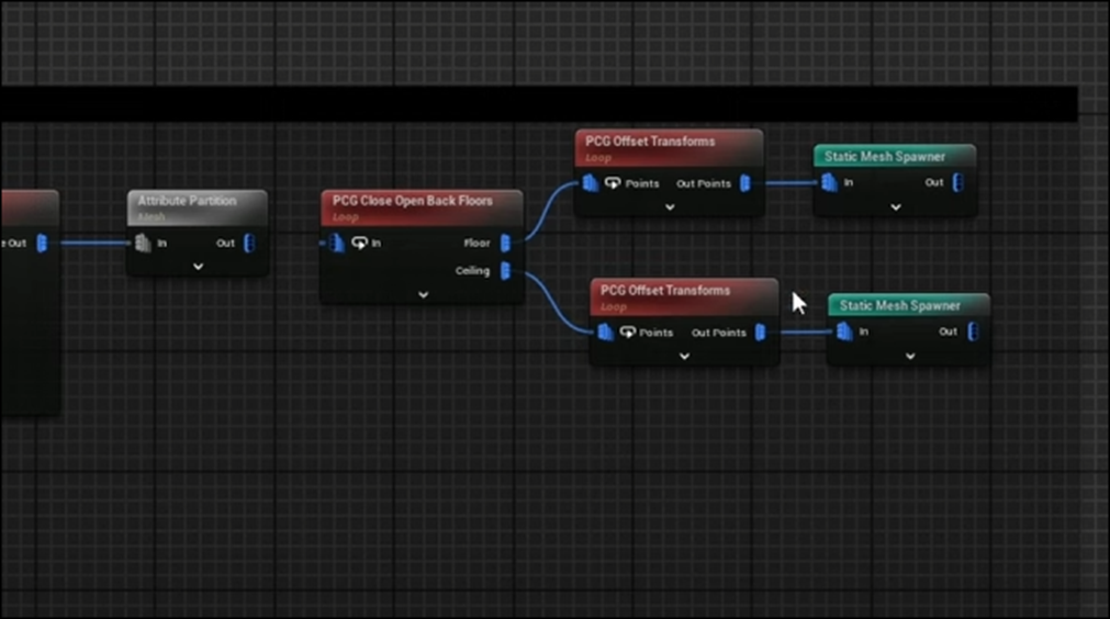 Attribute PartitionノードとPCG Close Open Back Floorsノードの繋ぎを外しました。
